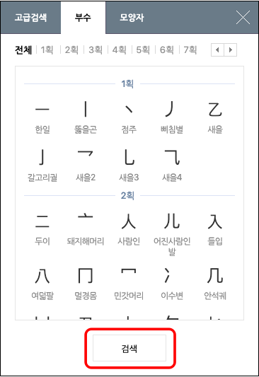 음과 한자를 모른다면 부수로 옥편 한자 찾기를 할 수 있습니다. 동일한 방법으로 고급 검색 메뉴로 이동한 후 부수 메뉴를 선택합니다. 검색을 원하는 부수를 선택하고 하단에서 검색을 클릭합니다.