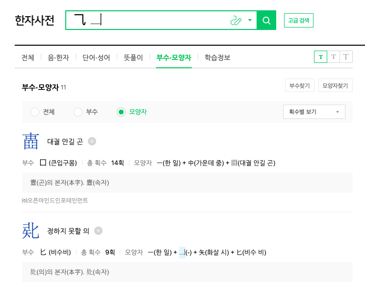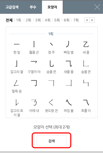 마지막으로 모양자로 찾는 방법이 있습니다. 기억나는 한자 모양을 2개 선택하여 검색하면 유사한 한자를 찾아주는 방식입니다. 고급 검색에서 모양자 메뉴를 선택하고 원하는 모양자 1~2개를 선택하고 하단에서 검색을 클릭합니다.