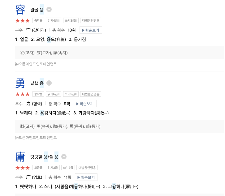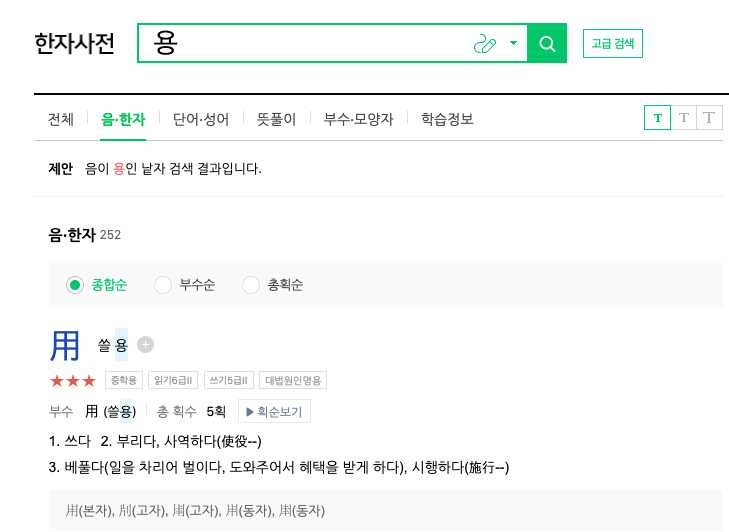 고급 검색 상단에서 음으로 찾기에 원하는 음을 한글로 입력하고 하단에서 검색을 누릅니다. 여기서는 ‘용’이라는 음으로 검색을 하였더니 쓸 용, 얼굴 용, 날랠 용, 떳떳할 용 등의 한자들이 검색되는 것을 확인할 수 있습니다.
