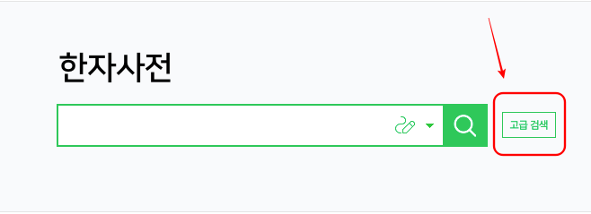 한자의 음은 생각이 나는데 글자 모양이 생각이 나지 않는 경우도 많습니다. 이럴 때는 음으로 찾아보는 것이 가장 정확한 방법이 될 텐데요. 방법은 옥편 그려서 찾기와 마찬가지로 한자사전 입력란에서 우측의 고급 검색을 클릭합니다.
