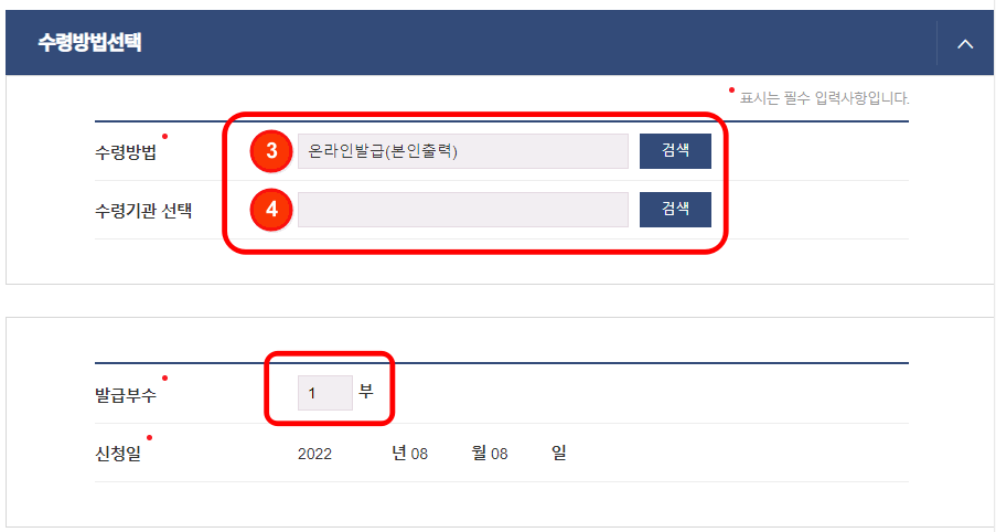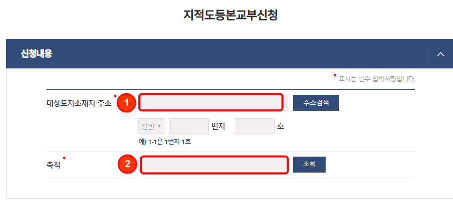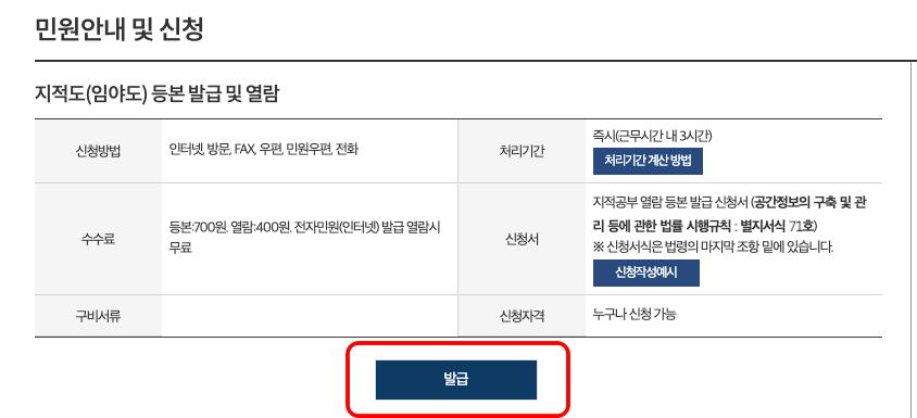 이후 지적도 등본교부 신청 화면이 표시됩니다. 먼저 주소와 번지, 호수를 입력하시고 축척을 조회하여 입력합니다. 수령방법과 수령 기관을 선택하시고 발급 부수를 입력한 후 하단에서 발급 버튼을 클릭합니다.