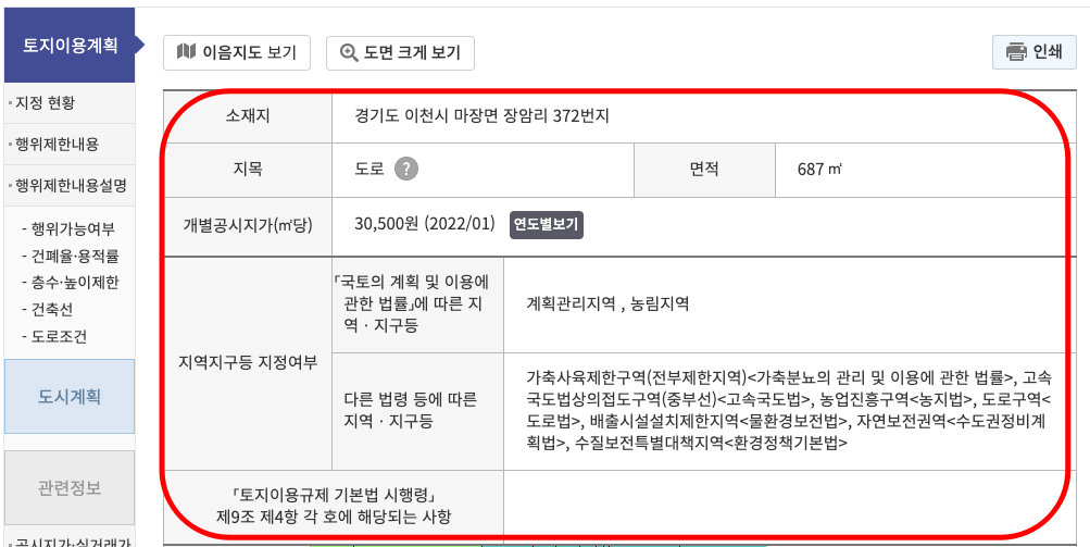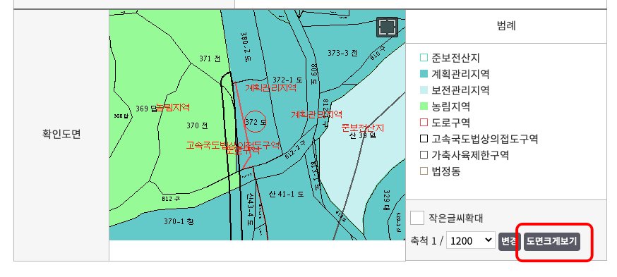먼저 소재지와 지목, 개별공시지가, 지역지구 등 지정여부까지 상세한 토지정보를 확인할 수 있습니다. 하단에서 확인 도면을 자세히 살펴볼 수 있으며 우측에 범례가 표시됩니다. 아래의 도면 크게 보기를 클릭해 보겠습니다.