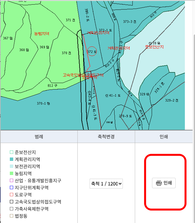 도면크게 보기를 사용하면 하단 인쇄 버튼을 선택하여 지적도 출력이 가능합니다.