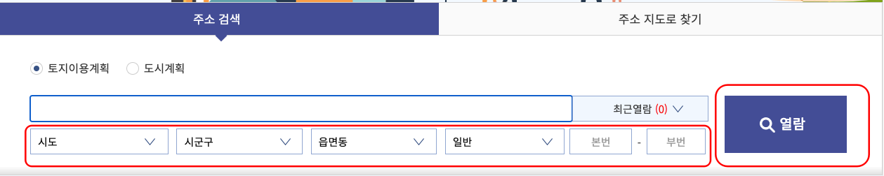 토지 이음 홈페이지 첫 화면에서 시도, 시군구, 읍면동, 일반, 본번, 부번까지 검색을 원하는 주소를 입력하시고 우측의 열람 버튼을 클릭합니다.