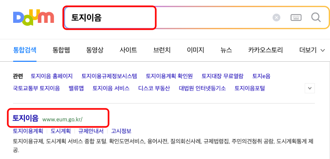 토지이음은 더 직관적인 지적도 무료열람 서비스를 제공하는 사이트입니다. 먼저 다음 포털 검색을 이용하여 ‘토지 이음’을 검색하고 바로가기합니다.