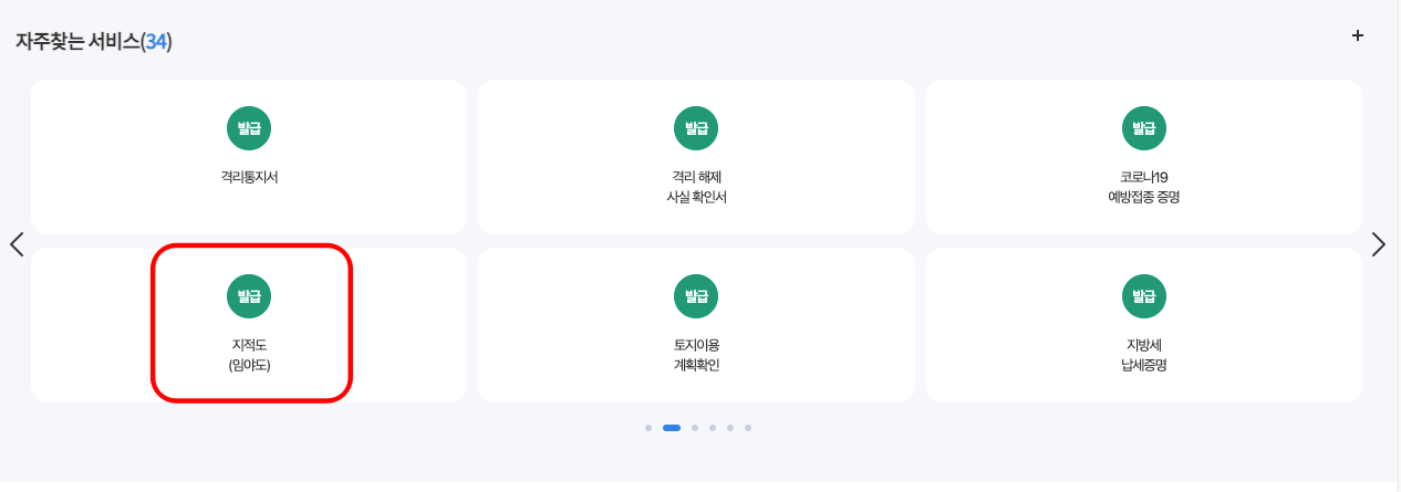 먼저 다음 포털 사이트 검색을 이용하여 정부 24를 검색합니다. 검색 결과를 확인하시면 바로가기를 확인할 수 있습니다. 정부 24에 도착하시면 본문에서 자주 찾는 서비스로 이동합니다. 이 메뉴에서 지적도 (임야도) 발급 메뉴를 클릭합니다.
